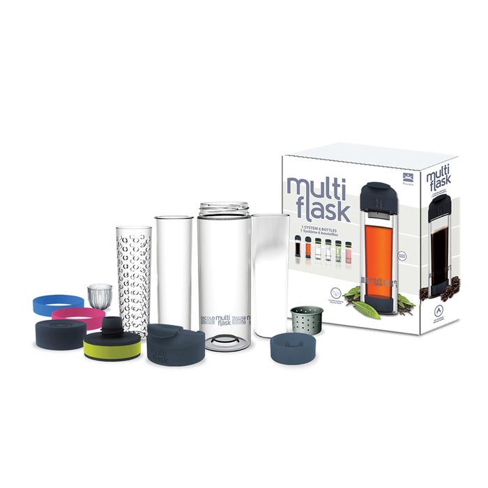 Multi Flask lets you have 6 different types of drink bottles in one system, reducing CLUTTER in your cabinet! Just assemble Multi Flask with the desired included parts, to get a perfect bottle for all your types of drinks like: 12 oz insulated Hot coffee or teas; or 20 oz cold drinks like Fruit Infusions (Very healthy!), Powdered Sports powder drinks (Mmm Smoothies!) which work with the shakeable 'Agitator' attachment to keep them stirred up