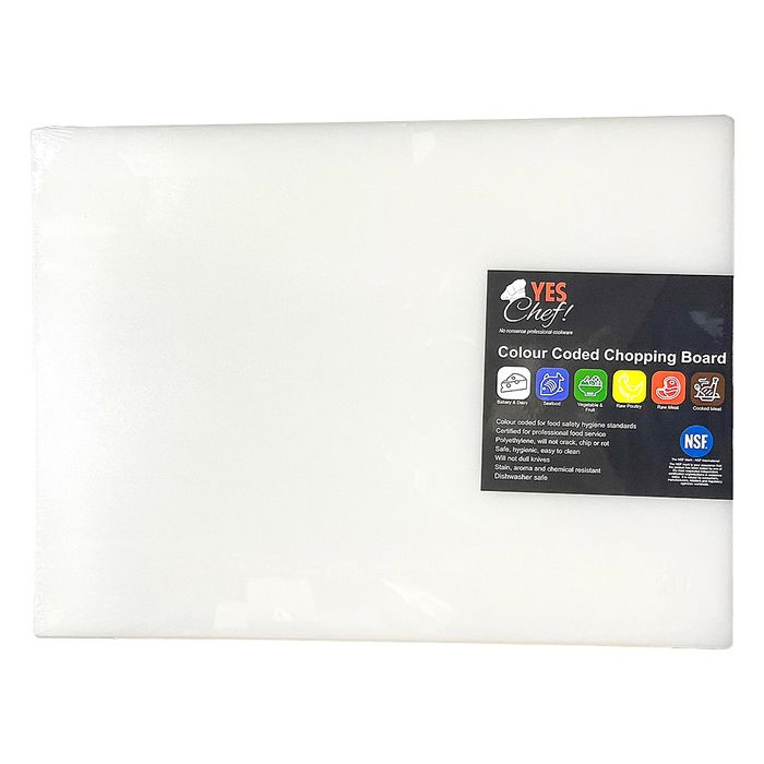 This white cutting board is designed for preparing bakery and dairy, helping to prevent cross-contamination in your kitchen. As part of a color-coded system, it promotes safe and hygienic food preparation by keeping raw meat separate from other ingredients.