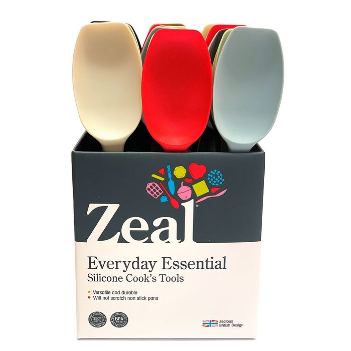 This unique Zeal flat ended silicone spoon is perfect for cooking and baking. Designed and developed to optimise the contact between spoon and pan, preventing food from sticking to hot pans during cooking. Stir, scrape and turn food with ease. Long tapered edge of the spoon scrapes not only bottom of bowls, but also the sides perfectly. This may be the most useful kitchen utensil you will ever buy and is one of our favourites.