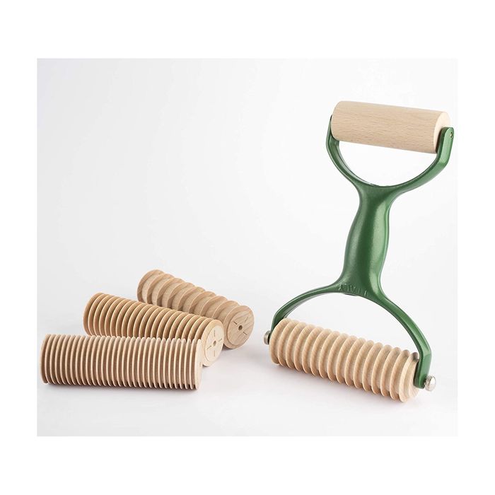 4 choices (all included) of removable beechwood rollers (overall length of each 4-13/16 inch) on other side of tool, for cutting strips out of the rolled-out pasta: 1 roller for pappardelle (widest strips), 1 for fettuccini (narrower strips), 1 for tagliatelle (narrower still) and 1 for tagliolini (narrowest)