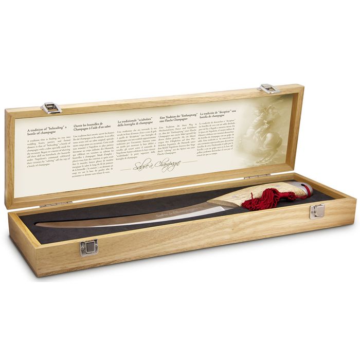A tradition of 'sabring' a bottle of Champagne comes from the time of Napoleon. His soldiers, Hussards, when celebrating their victories, would knock the top off the bottle with their sabre while they were on horseback. This tradition is still present in some wedding parties or informal dinners, sans horse.