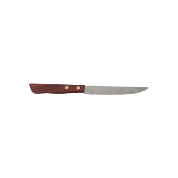 20cm serrated steak knife with a wooden handle and pointed tip.