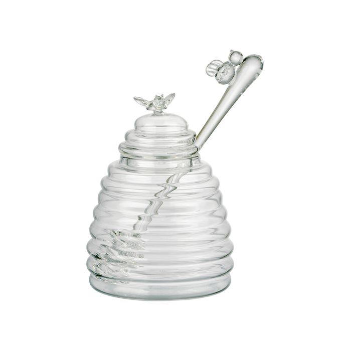 The lid of the pot & top of the drizzler are each adorned with a beautiful & detailed bees.
