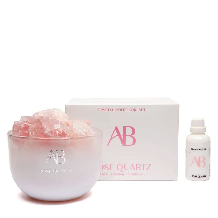 Rose Quartz Potpourri Set contains; Glass Bowl, Rose Quartz Crystals and 50ml (1.7fl oz) Fragrant Oil.