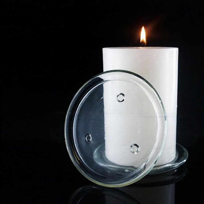Clear glass candle plate, 140mm diameter - holds a candle with width up to 100mm. Pictured with pillar candle code 206/H (not included).