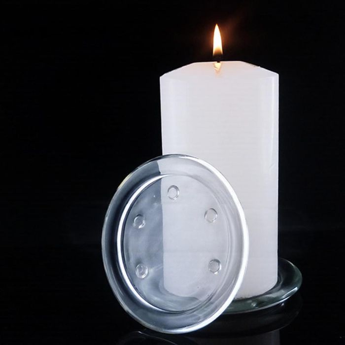 Clear glass candle plate, 110mm diameter - holds a candle with width up to 75mm. Pictured with pillar candle code 208/H (not included).