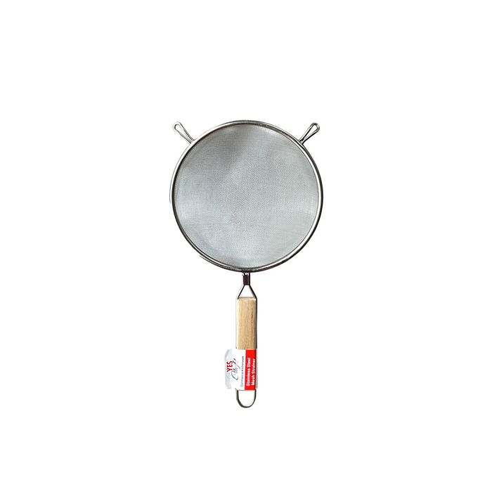 This single fine mesh strainer features an easy-to-grip wooden handle with large hooks for hanging on pots, pans, or bowls. It also includes a convenient hole at the end of the handle for easy storage.