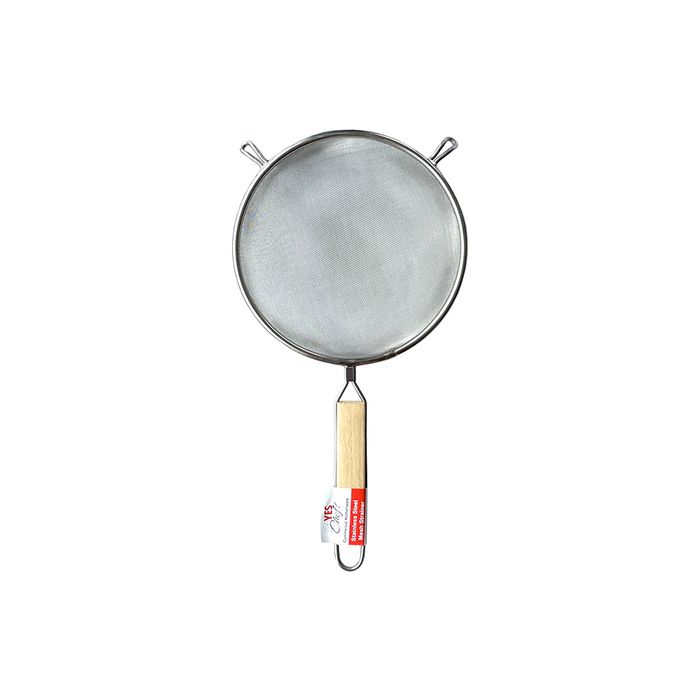 This single fine mesh strainer features an easy-to-grip wooden handle with large hooks for hanging on pots, pans, or bowls. It also includes a convenient hole at the end of the handle for easy storage.