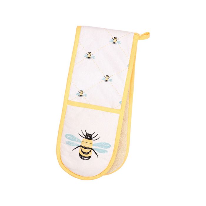 Stay protected when handling hot pots and pans with these bee-autifully designed double oven gloves. An exciting new collection of kitchen textiles and accessories, Bees Knees has been inspired by the importance of bees to our ecosystem. Add a touch of nature to your kitchen with this 100% cotton design featuring the bee, natural hues and pops of yellow. These doubvle oven gloves will look great in both modern and country kitchens and when you buy, 2% of the retail price is donated to the Bumblebee Conservation Trust. These double oven gloves have a polyester filling and conform to the regulated BS standards (BS6526-1998). Made from 100% of the finest cotton; we recommend machine washing at 40°C with similar colours. Measuring at 33 x 18cm thse double oven gloves come in cute kraft packaging. Conforms to (EU)2016/425. This product meets the design requirements of BS6526:1998. Tested to EN12127-1 (250°C)