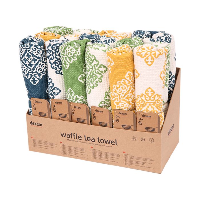 A CDU of 18 waffle tea towels - six designs in our classic Ochre, Ink Blue and Green Sintra colours. Made from 60% recycled cotton and 40% cotton. Recycled cotton means less waste going to landfill and avoids the large water footprint associated with growing virgin cotton. The soft and absorbent waffle weave allows the tea towel to dry quickly and leaves no lint or residue. Each has a handy hanging loop. Supplied in a branded CDU ready to be placed on shelf. Each tea towel is also individually wrapped with a swing tag. One of the many products in our Sintra collection. Explore the full Sintra collection and bring colour and vibrance to any kitchen!