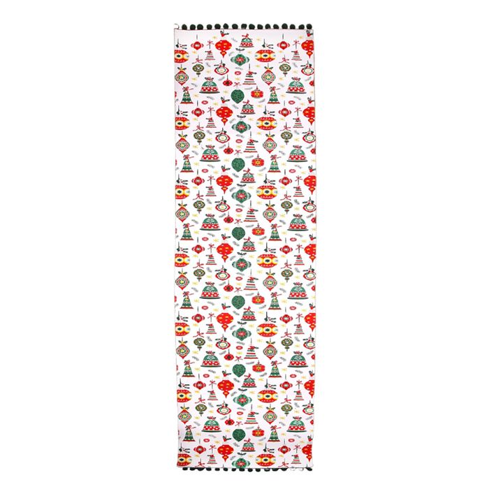 Set a joyful tone for your festive feasting with our Festive Baubles Table Runner. Featuring a vibrant all-over print of Christmas baubles and trees in classic red, green and gold, this runner instantly transforms your dining table into a holiday centrepiece. Whether you're hosting Christmas dinner or a seasonal get-together, it's the perfect finishing touch for your festive spread. Crafted from a planet-friendly fabric blend and finished with a charming green pom-pom trim, it's designed to be reused and enjoyed year after year.