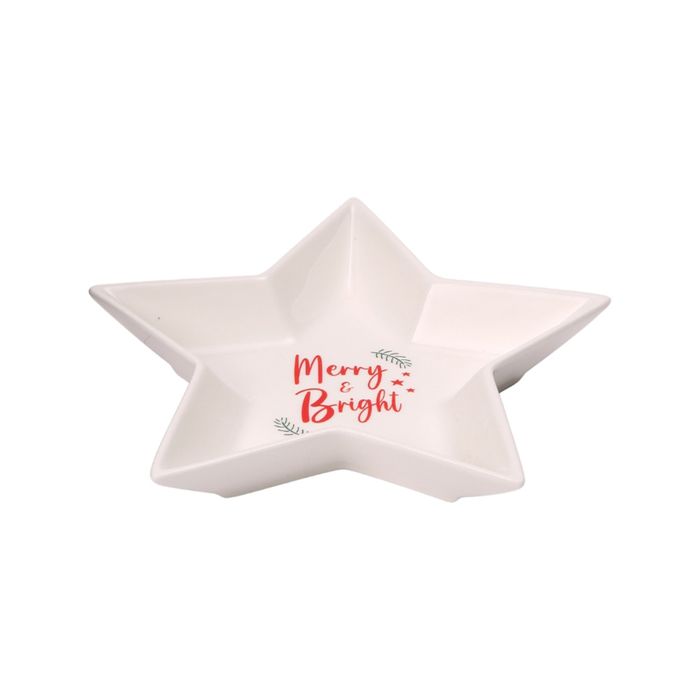 Add a twinkle of festive charm to your table with this small Merry & Bright Star Dish. Perfect for serving up nibbles - sweet treats - or festive snacks - this ceramic dish is shaped like a star and features a joyful Merry & Bright message at the centre. Whether used on its own or as part of a larger Christmas tablescape. A beautiful way to add a little sparkle to your seasonal hosting.