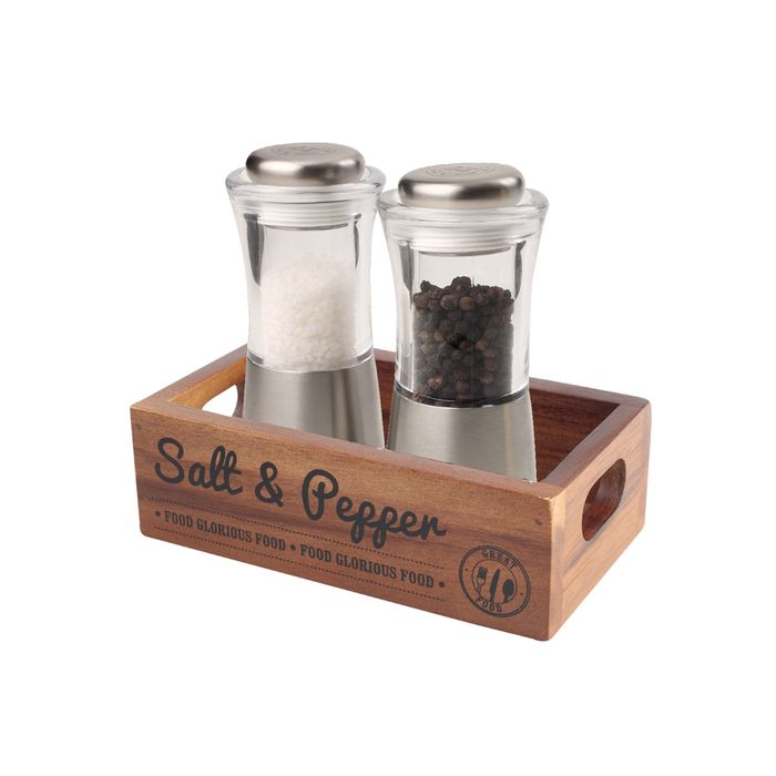 Food Glorious Food Salt & Pepper Crate T&G Woodware Fabulous looking and a practical solution with T&Gs crates and mill rests, theres no mess on tables and work surfaces. A pair of mills look stunning displayed in this way. A great gift. Dimensions