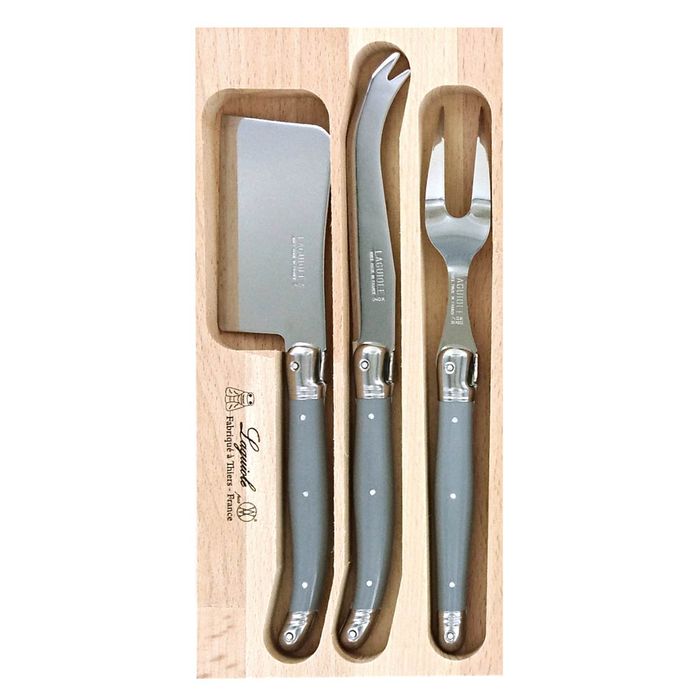 Verdier 3-Piece Cheese Knife Set, made in Laguiole, France by Andre Verdier. This set includes three essential tools for serving and enjoying cheese, each made of stainless steel blades and resin handles, complete with the iconic Laguiole Bee.