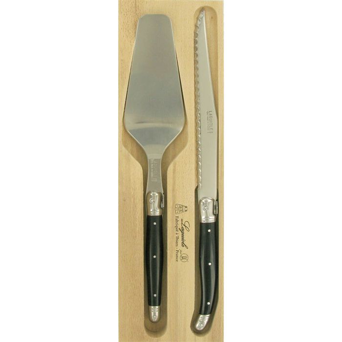 Andre Verdier Debutant Laguiole Cake Knife and Slice Set. Made in France, this set includes a stainless steel cake knife and server with coloured resin handles, each featuring the iconic Laguiole Bee. Practical and beautifully made, this set is perfect for special occasions or everyday use.