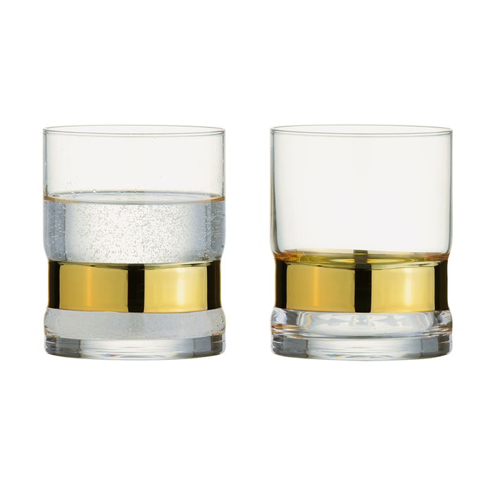 The Soho Double Old Fashioned Tumblers feature a sleek design with straight sides and a recessed gold band that adds a bold metallic detail to each glass. These tumblers are perfect for serving whiskey, cocktails, or your favourite spirits.